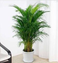 散尾葵,又名黄椰子,为丛生常绿灌木或小乔木。茎干光滑,黄绿色,无毛刺,嫩时披蜡粉,上有明显叶痕,呈环纹状。叶面滑细长,羽状复叶,全裂,长40~150cm,叶柄稍弯曲,先端柔软;裂片条状披针形,左右两侧不对称,中部裂片长约50cm,顶部裂片仅10cm,端长渐尖,常为2短裂,背面主脉隆起;叶柄、叶轴、叶鞘均淡黄绿色;叶鞘圆筒形,包茎。肉穗花序圆锥状,生于叶鞘下,多分支,长约40cm,宽50cm;花小,金黄色,花期3~4月。果近圆形,长1.2cm,宽1.1cm,橙黄色。种子1~3枚,卵形至椭圆形。基部多分蘖,呈丛生状生长。